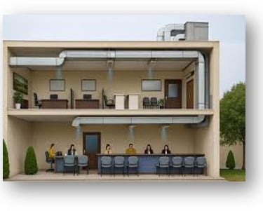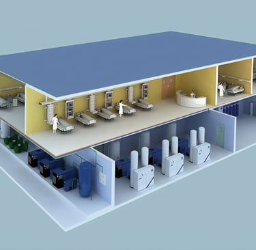 أنظمة سحب الدخان والتهوية: تنفيذ أنظمة تهوية غرف العمليات والعناية المركزة وفقاً للاشتراطات الصحية الصارمة.